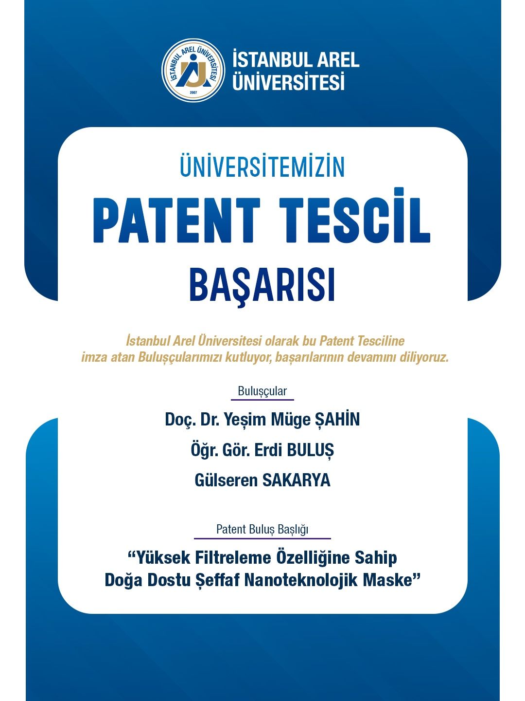 Akademisyenlerimizin özverili çalışmalarıyla geliştirilen “YÜKSEK FİLTRELEME ÖZELLİĞİNE SAHİP DOĞA DOSTU ŞEFFAF NANOTEKNOLOJİK MASKE” başlıklı buluşumuz, Türk Patent ve Marka Kurumu (TÜRKPATENT) tarafından başarıyla tescil edilmiştir!
